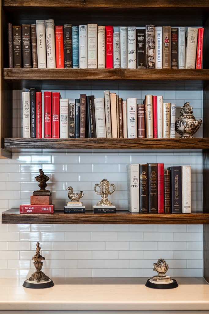 13. Open Shelving with Display Stands for Cookbooks and Decor