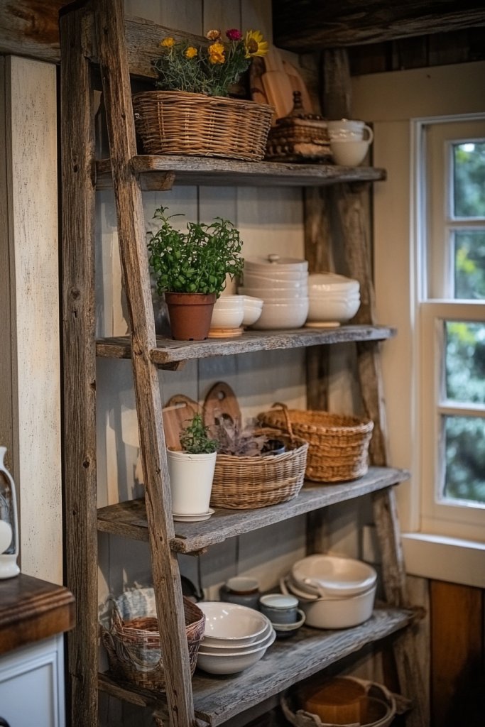 Find a sturdy vintage ladder or repurpose an old wooden one. Lean it securely against the wall, ensuring stability. Decorate with woven baskets and textured fabrics, layering items for depth. Use the rungs for hanging utensils, small pots, or towels, secured with hooks or clips. Keep the arrangement balanced, and periodically refresh the decor for seasonal updates. It’s a simple DIY project with a big visual payoff.