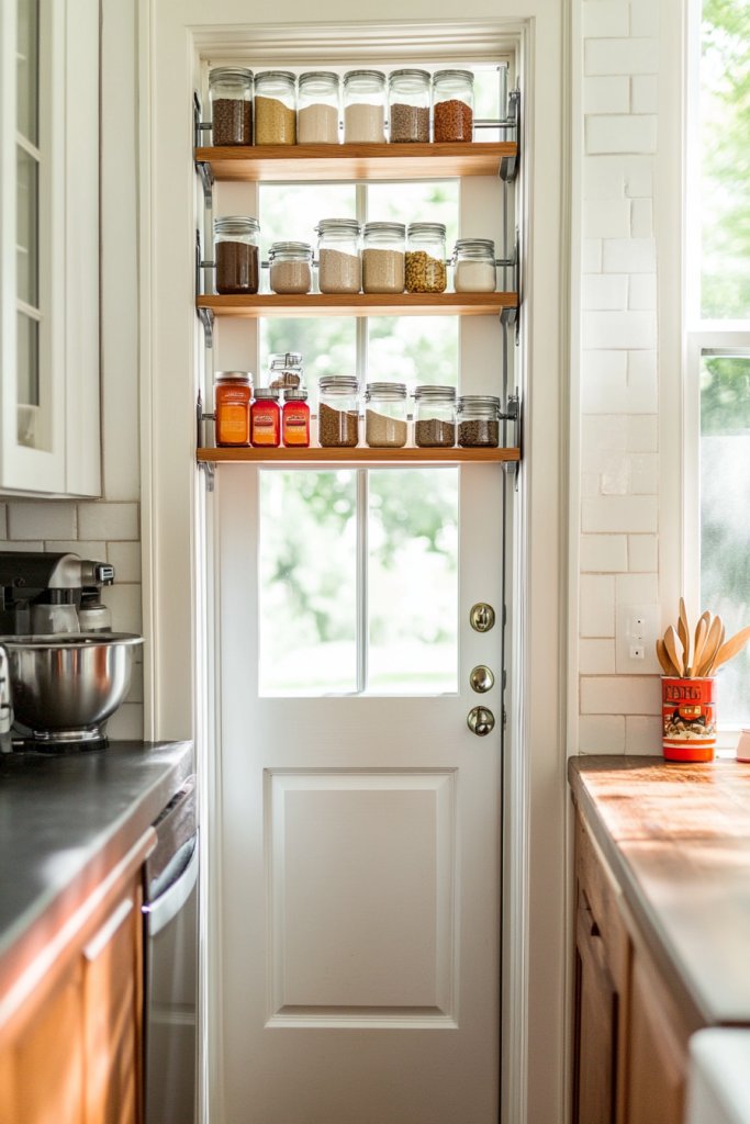 Running out of storage and counter space? Over-the-door open shelves are a clever way to utilize underused wall space above doorways or narrow spots. They’re perfect for keeping essentials within reach without crowding your main kitchen area. Plus, they add a touch of functional style.