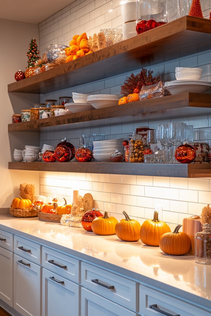 Picture shelves decorated with seasonal dishware, textiles, and accessories—think pumpkin-shaped bowls in fall or colorful Easter eggs in spring. Mix in themed textiles or small decorative objects that evoke holidays or seasons. The display is layered and curated, with items arranged to create a lively, inviting scene. Lighting highlights these seasonal accents, making your kitchen feel alive and festive.