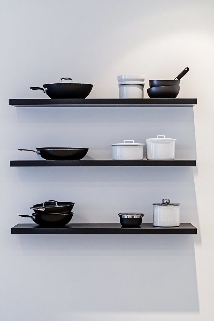 Picture slim, matte black metal shelves mounted high on a crisp white wall, creating a floating effect. On the shelves, uniform black and white pots and pans are stacked neatly, their clean lines echoing the shelves’ minimal design. The contrast between the metal and the monochrome cookware emphasizes simplicity and order. Soft ambient light highlights the sleek silhouettes, adding a touch of sophistication.