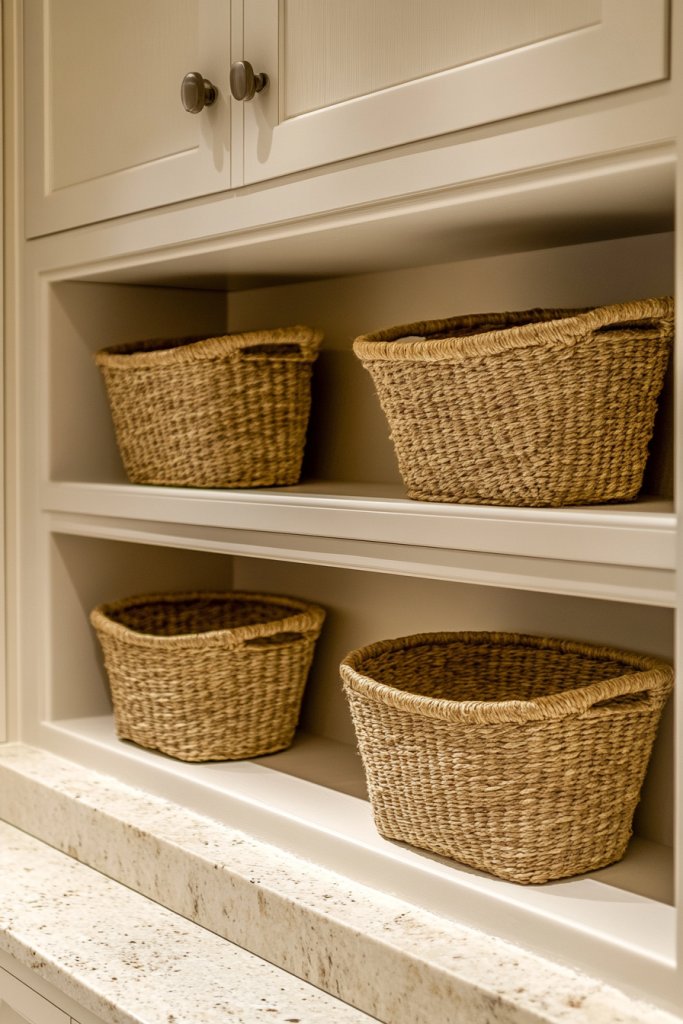 Personalize these storage niches with decorative baskets in colors or textures that match your style. Add small labels or tags to baskets for easy identification. Incorporate seasonal touches like faux greenery or themed textiles—without plants, of course—to keep the space lively. You can also add small decorative trays inside for serving or display purposes, elevating the functionality.