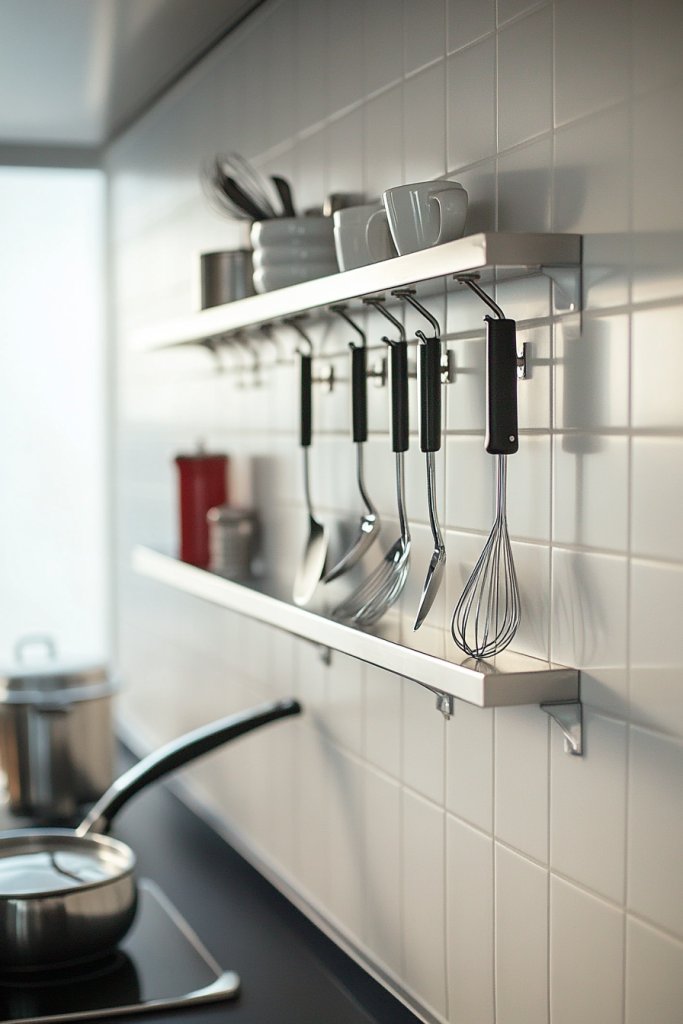 Picture narrow metal or wooden shelves mounted just below cabinets or on empty wall space. From hooks hang utensils, ladles, and measuring spoons—organized yet accessible. The hooks add a rhythmic pattern to the wall, giving the space a dynamic, organized feel. The shelves themselves can be minimalist, blending seamlessly into your decor. The combination of open space and hanging items creates a balanced, practical aesthetic.