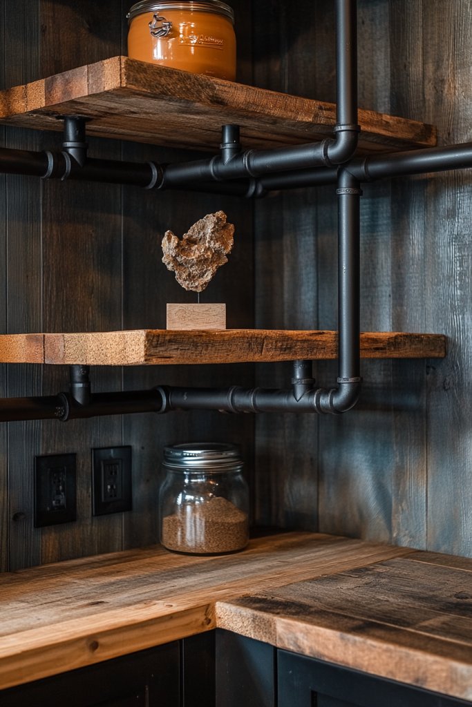 Imagine black metal pipes with exposed fittings supporting thick, weathered wood planks. The raw textures of both materials create a striking contrast—smooth, dark metal against rough, aged wood. Items like cast-iron pans or vintage jars sit atop, completing the industrial vibe. The open design allows your kitchen’s personality to shine through, with an overall aesthetic that’s both functional and decorative.