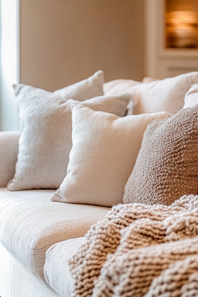 Envision a plush wool throw draped over a sofa or linen cushions in earthy tones scattered across a neutral sofa. The rough yet refined textures catch the light and invite touch. Imagine soft, natural fibers that add depth to plain surfaces, creating a layered, tactile experience. These fabrics soften the overall look while adding warmth and comfort.