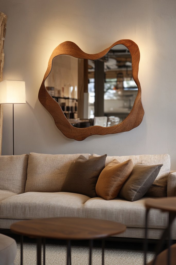 Imagine a large, freeform mirror with a gentle, flowing edge hanging above your sofa. The mirror’s irregular shape reflects light beautifully, bouncing it around the room and creating a sense of openness. Its organic form echoes natural elements and adds a sculptural element to your decor. The reflection of textured walls or cozy textiles further amplifies the inviting atmosphere.