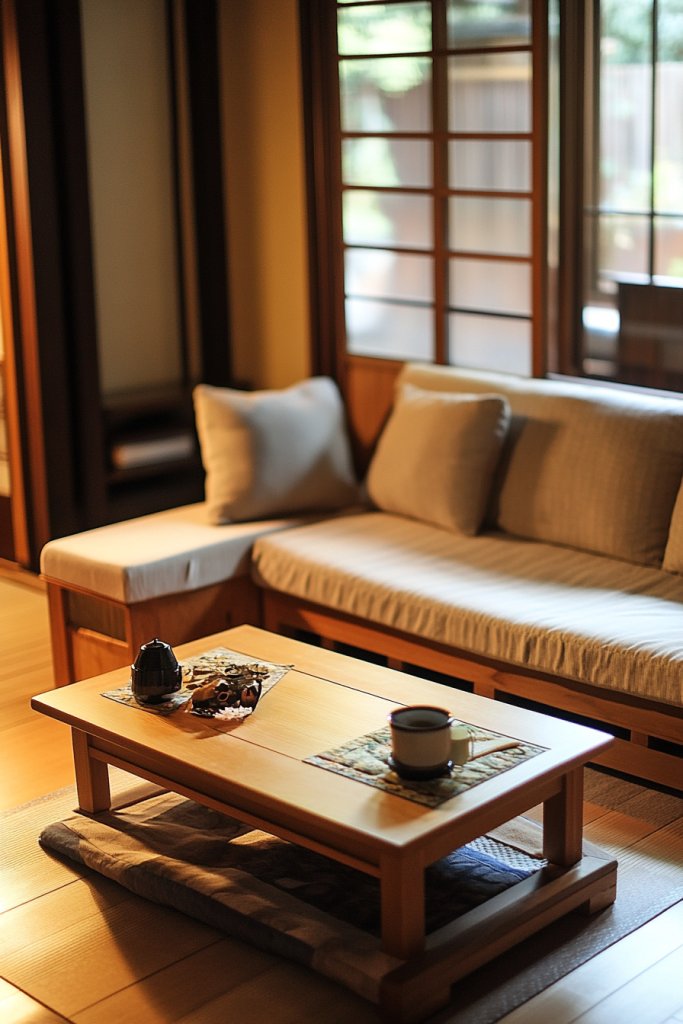 Select a low-profile sofa with a simple frame and natural fabric upholstery. Prioritize comfort with supportive cushions and flexible seating options. Keep legs minimal or hidden to enhance the low-slung aesthetic. Place in an open area to maintain flow, and add a textured rug underneath for grounding.