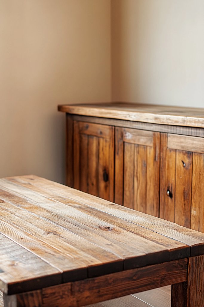 Personalize with handcrafted details—like custom carved handles or painted accents on reclaimed wood furniture. Add woven baskets or fabric-lined drawers to increase functionality. Mix different wood tones for a layered, eclectic look. Keep the finish natural or experiment with light stains for a custom touch that highlights the wood’s history.