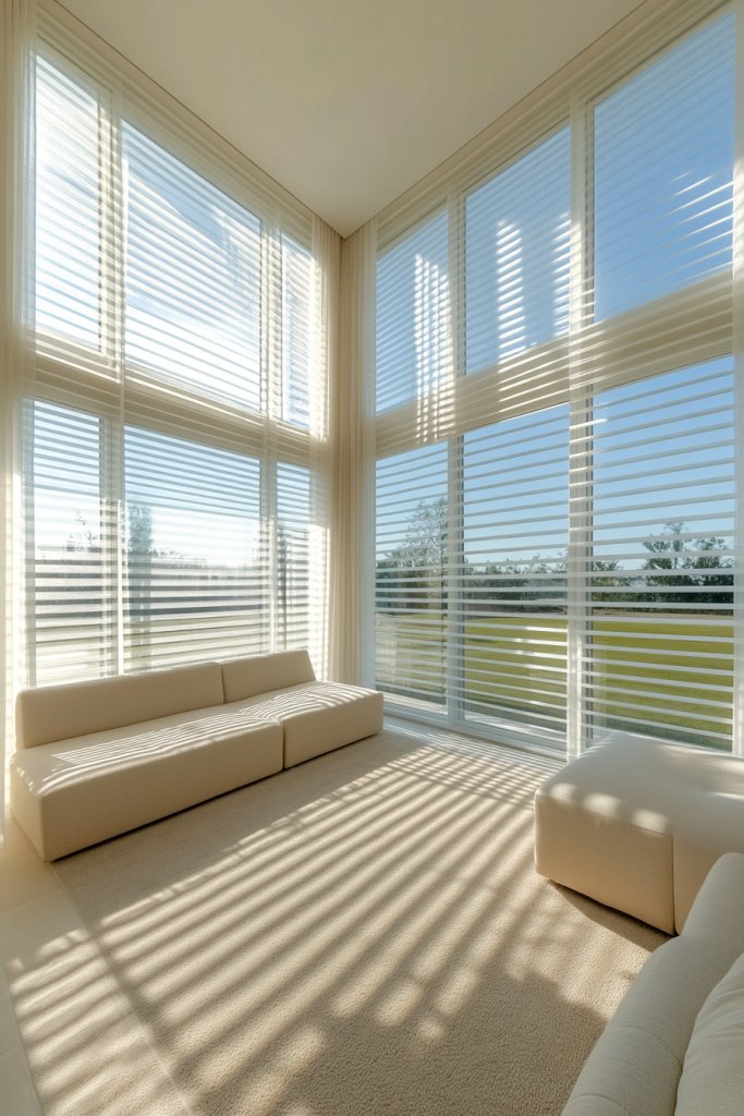 Imagine a wall of floor-to-ceiling windows with sheer, airy curtains that flutter with the breeze. The sunlight dances across neutral walls and textured rugs, creating a lively yet calming atmosphere. Minimal window treatments allow the outside in, emphasizing views and connecting your indoors with nature. Bright, natural light enhances every surface and color, making your space feel alive.