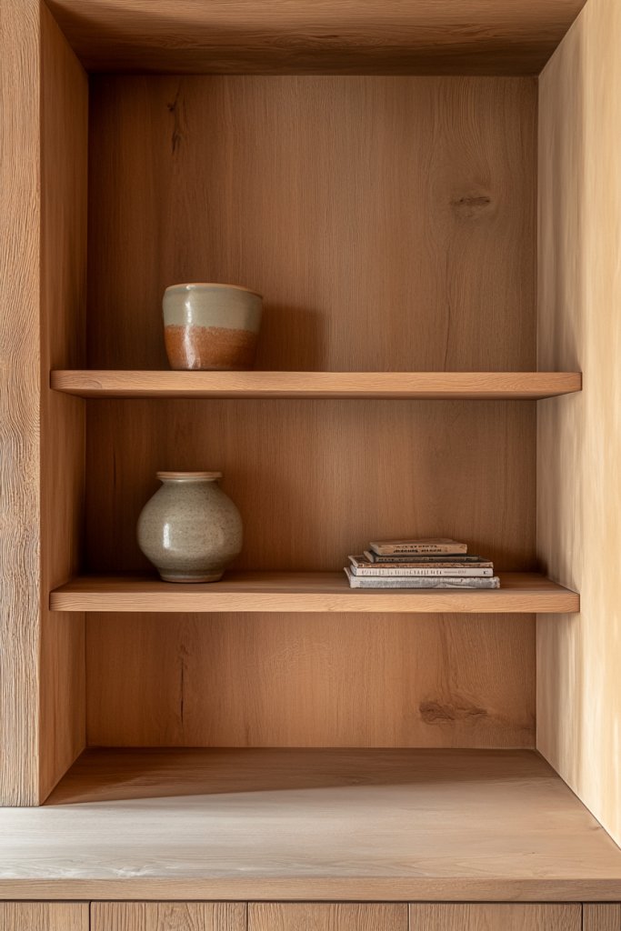 Select sturdy, natural wood or matte-finish shelving units. Mount them securely at eye level or higher for visual balance. Arrange your items in a balanced yet dynamic way, combining height, texture, and color. Use hidden brackets or wall anchors for a clean look. Keep clutter to a minimum to preserve the simplicity.