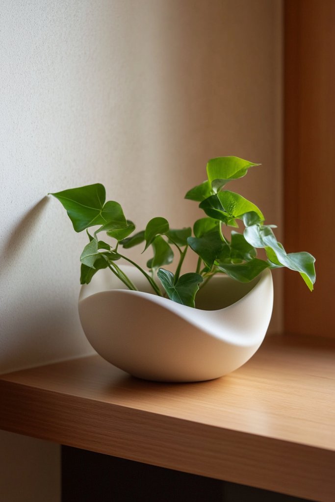 Select planters made from sustainable materials with a matte finish for a soft aesthetic. Ensure proper drainage or add a layer of gravel inside to prevent overwatering. Position them where they’ll receive adequate natural light. Use natural fiber or cork pads underneath to protect surfaces. Water and prune as needed to keep plants healthy.