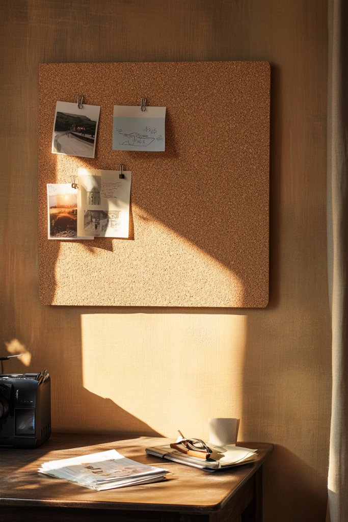 Picture a woven jute or cork panel mounted on a wall, dotted with simple notes, sketches, or important reminders. The textured surface adds tactile depth, contrasting with smooth walls and furniture. Small, handcrafted clips or pins in wood or ceramic hold your items, making the display feel like a piece of textured art. The neutral tones tie seamlessly into your organic decor.