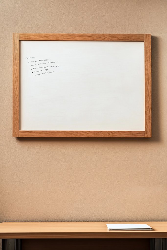 Imagine a sleek, natural-finish wooden whiteboard mounted on a wall, with handwritten notes or sketches in soft chalk or chalk markers. The warm wood grain contrasts beautifully with the crisp, white writing surface, creating a cozy yet functional focal point. Nearby, simple wooden or ceramic accessories complete the scene, enhancing the organic vibe. It’s both a tool and a piece of art.