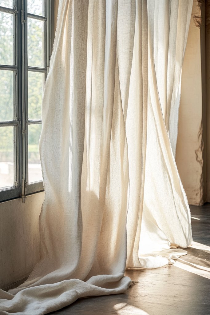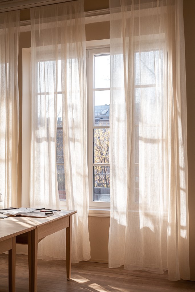 Picture sheer linen curtains in soft off-white or sandy tones, gently billowing with a breeze. They diffuse harsh sunlight, creating a warm, inviting glow across the room. The lightweight fabric adds a delicate texture against the window frame, complementing wooden or matte-finish furniture. The simplicity of the treatment enhances the organic vibe, making your workspace feel open and serene.
