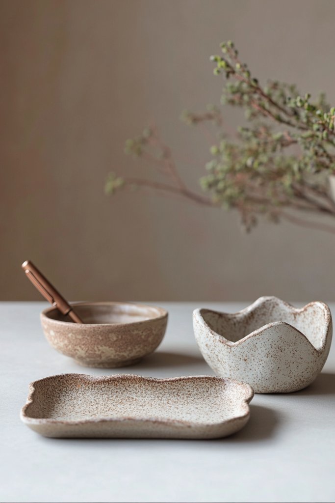 Choose ceramics with flowing, organic shapes or geometric forms in neutral tones for a modern touch. Incorporate small planters or trays that double as catch-alls for jewelry or keys, avoiding the need for vases or plants. Mix and match textures, like rough clay with glazed finishes, to add visual interest. Seasonal color updates can keep the look fresh.