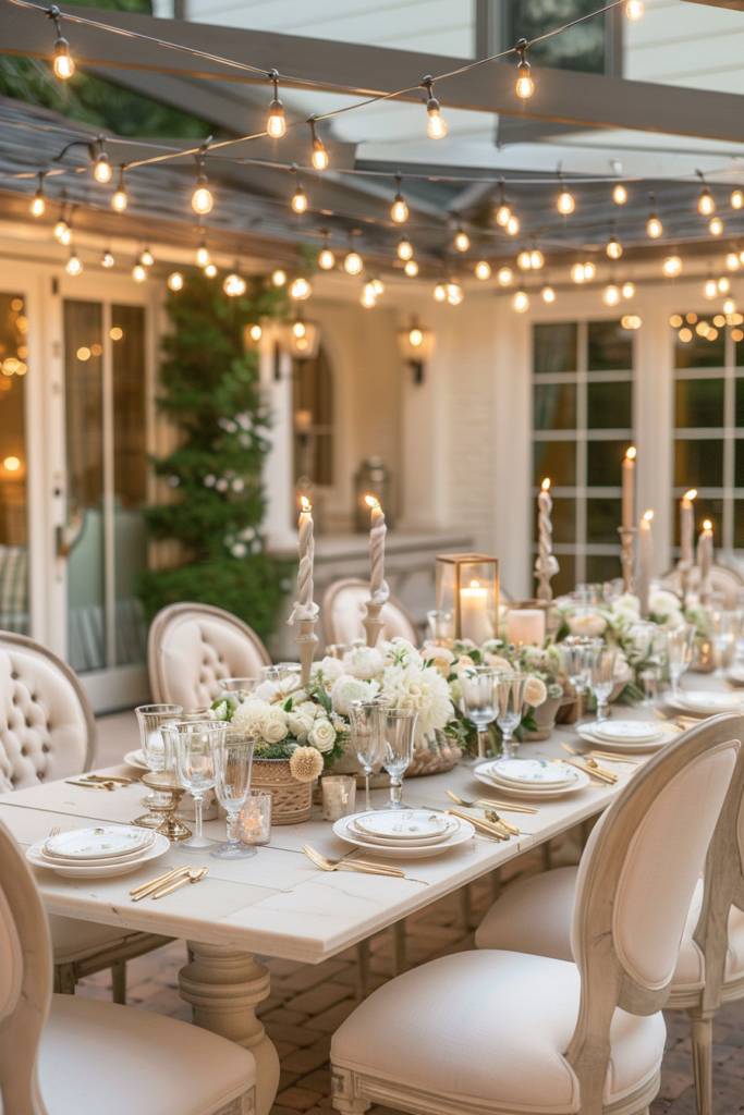 Consider a centerpiece, such as a chic floral arrangement or lanterns, to create a warm atmosphere. Ambient lighting, like string lights or overhead fixtures, sets the mood for intimate gatherings.
