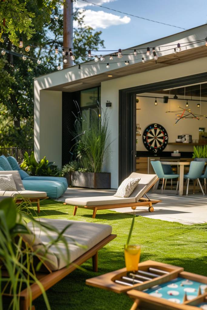 For a more structured setup, invest in a ping pong table or a shuffleboard for those competitive spirits who crave precision. You might even hang a chalkboard nearby to keep score of your games, adding a playful touch to your outdoor entertainment.