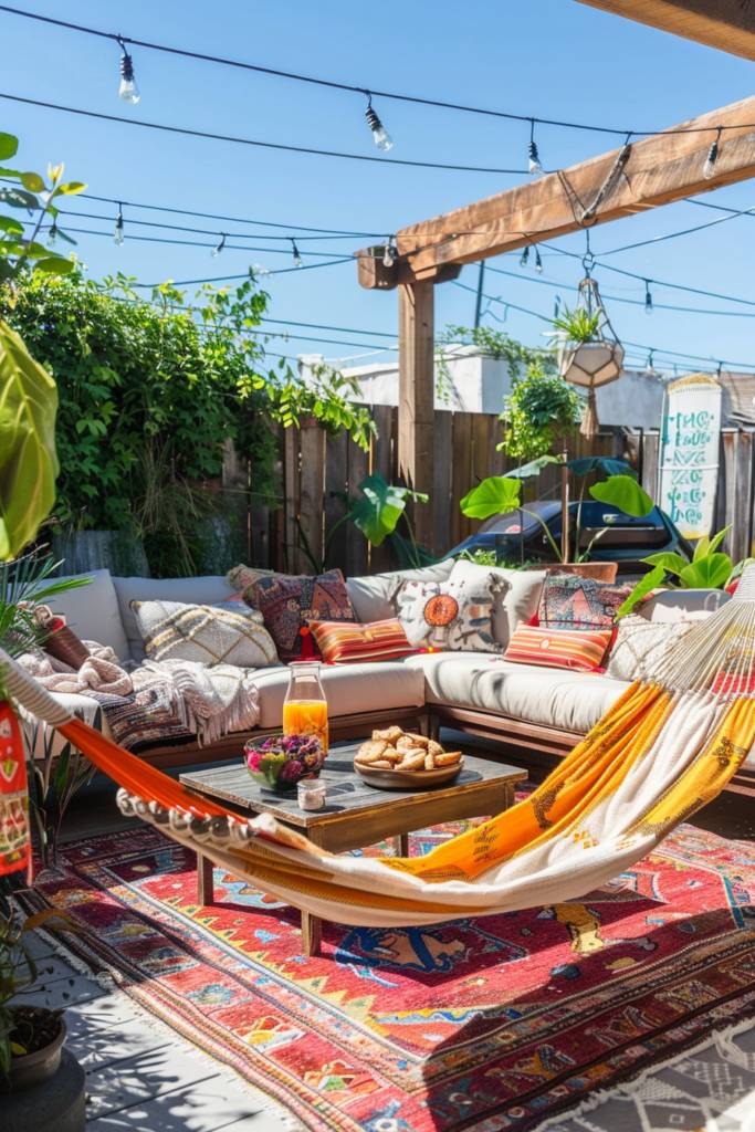 Don’t forget a small side table nearby for your favorite drinks or snacks; it’ll make lounging even more enjoyable. With a hammock hangout, you’ll have the perfect spot for relaxation, reading, or simply unwinding after a long day. Embrace the serenity and let your outdoor space become a slice of paradise.