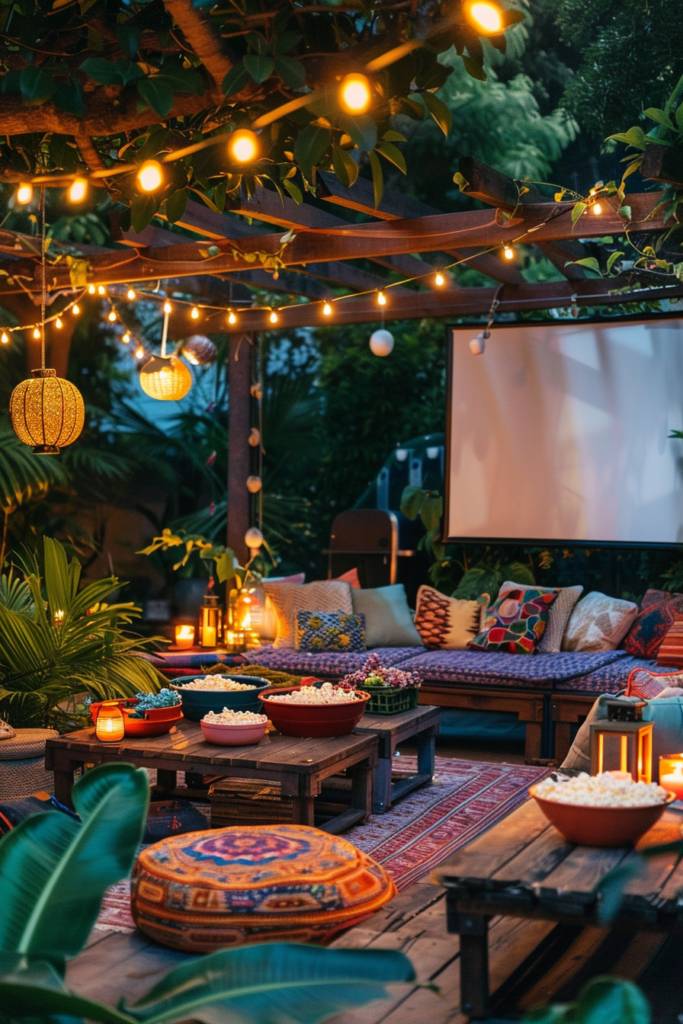 Imagine the excitement of gathering friends and family under the stars for a cozy outdoor movie night, where laughter and cinematic magic blend seamlessly. To set the scene, start with a large, white sheet or a portable projector screen. Use a projector that’s bright enough to cut through ambient light. Cozy blankets and oversized cushions create a welcoming seating area, while string lights add a warm glow.
