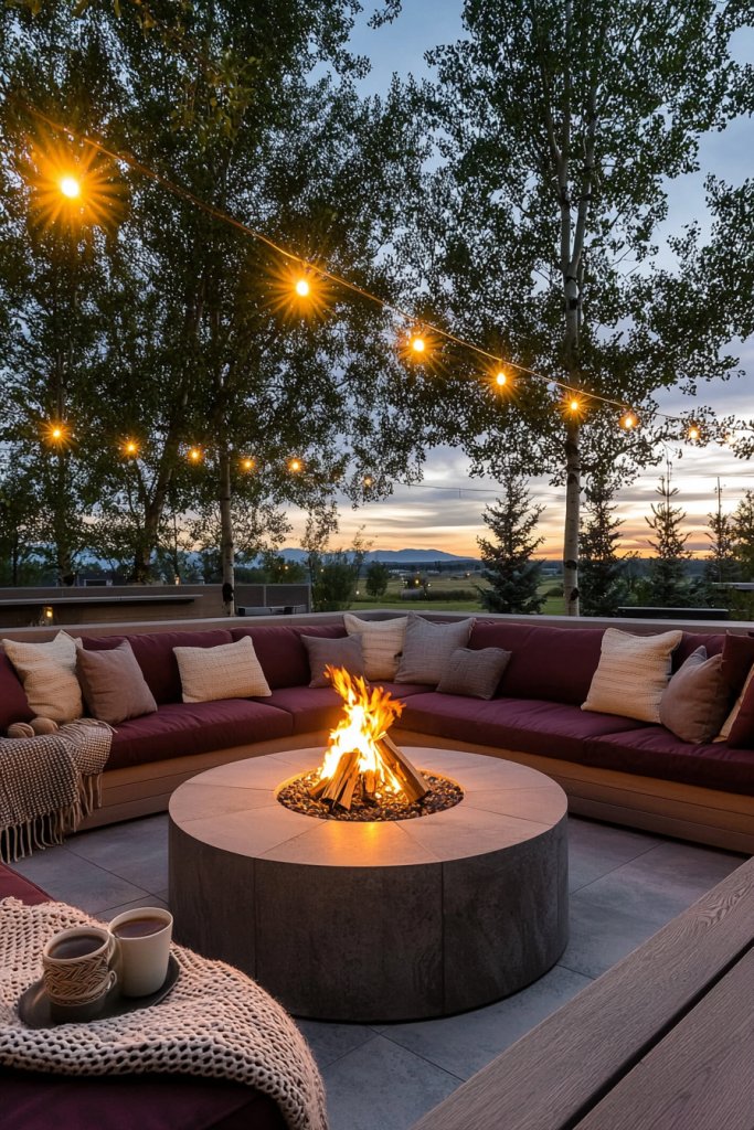You can choose a pergola adorned with climbing vines or curtains that offer privacy while still allowing the glow of the fire to shine through. Opt for comfortable seating, like oversized cushions or a sectional sofa, to invite relaxation.