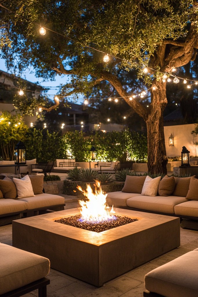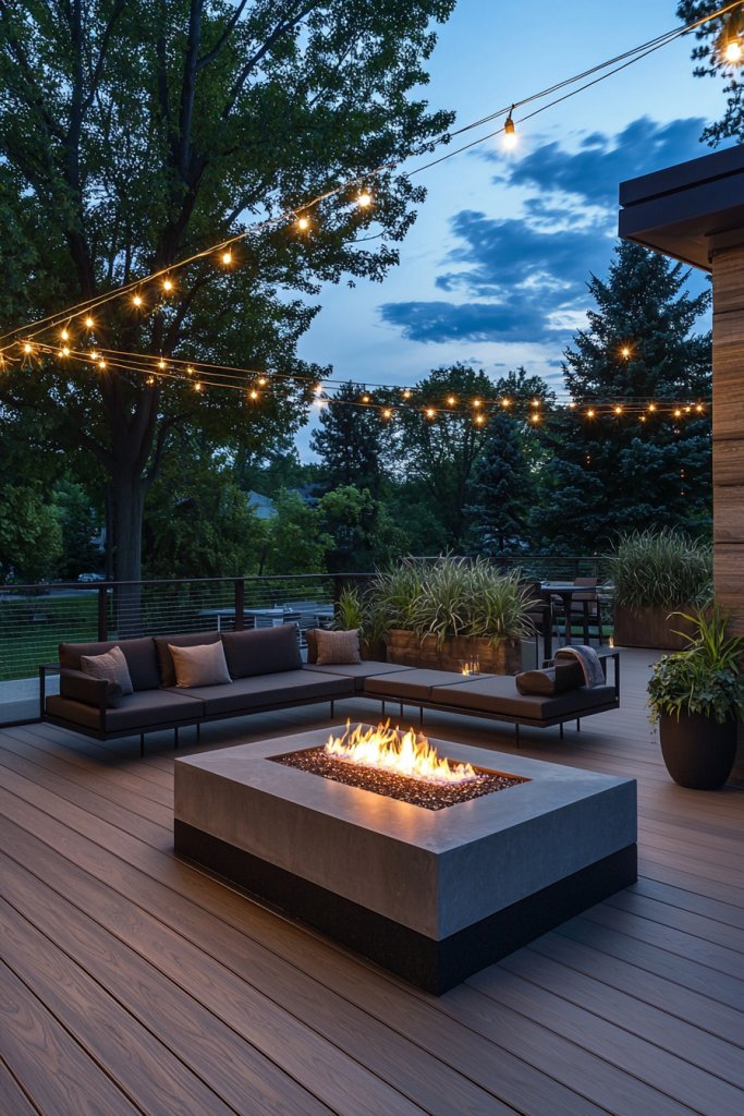 Consider incorporating built-in seating or sleek benches, which can double as storage for firewood or outdoor cushions. Add soft lighting with string lights or lanterns to elevate the ambiance further.