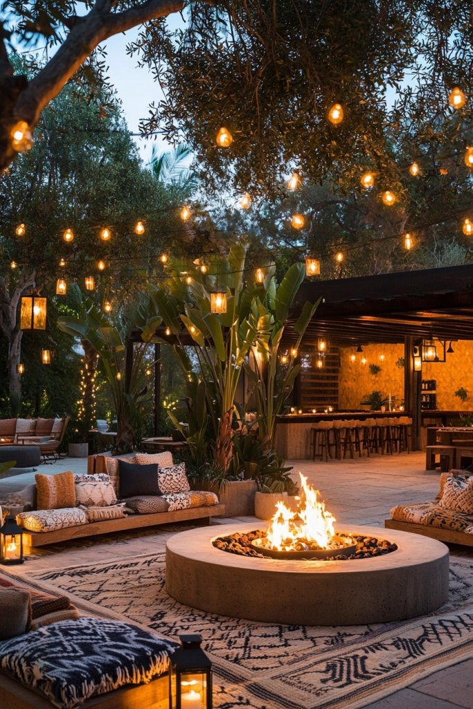 Use natural materials like stone or reclaimed wood to create the fire circle itself, blending it with the lush greenery around you. String fairy lights overhead to set a magical ambiance, and don’t forget to add some boho rugs for extra comfort underfoot.