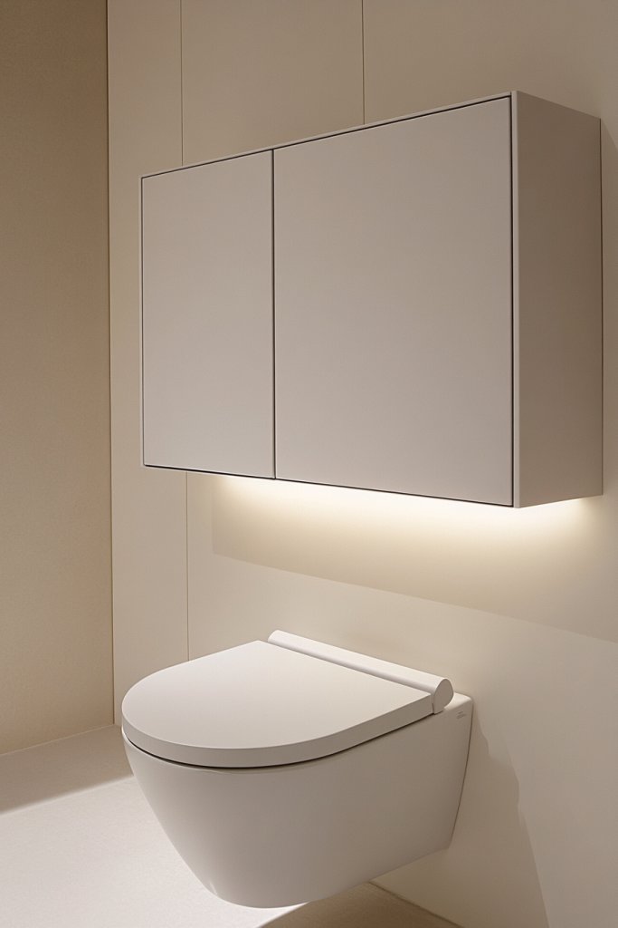 Imagine a narrow cabinet mounted high on the wall, flush with the wall surface, with no visible handles. Its matte finish blends seamlessly with your bathroom tiles, creating a smooth, uninterrupted surface. Inside, neatly organized toiletries and towels are just a gentle push away, thanks to soft-close mechanisms. The minimalist aesthetic makes your bathroom look airy and contemporary.
