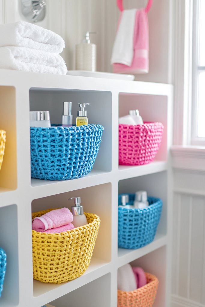 Use different sizes and colors of baskets to match your personality and decor. For a more sophisticated look, choose monochrome baskets with textured finishes. For kids’ bathrooms, incorporate playful patterns and bright hues. You can also add decorative labels or tags for easy organization.