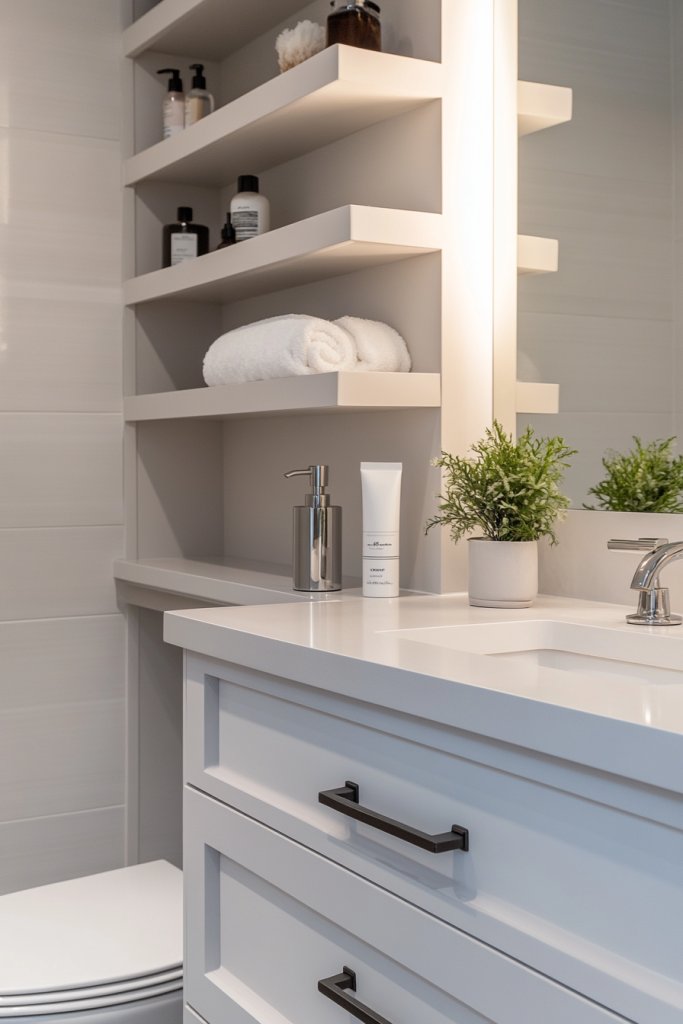 Open shelves turn your bathroom into a functional showcase of your style. They prove that organization doesn’t have to be boring. Once styled, they boost your confidence in creating a space that’s both practical and beautiful, making daily routines more enjoyable.