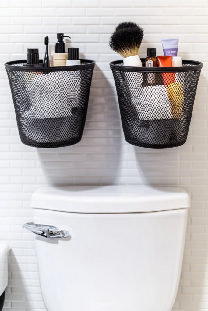 Picture sleek, metal mesh baskets hung on the wall above the toilet, holding everything from cotton pads to brushes. The open design allows you to see everything at a glance, while the metal mesh adds an industrial-chic vibe. Keep the baskets organized with labels or color coding for extra flair. Soft lighting or decorative accents complete the look.