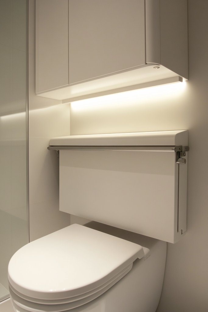 Fold-down shelving embodies smart, space-efficient design. It proves that small spaces can be highly functional with a touch of creativity. Once you see how it maximizes your bathroom’s utility, you’ll be inspired to add more innovative storage solutions.