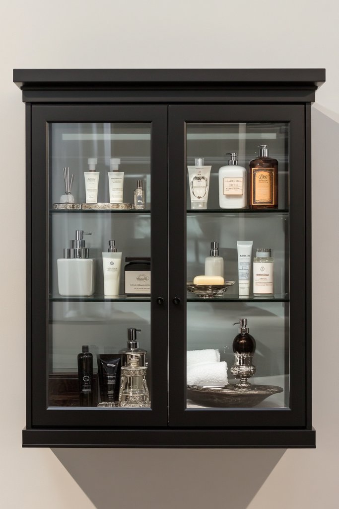 Visualize a sleek cabinet with clear glass doors mounted above your toilet. Inside, your toiletries and accessories are arranged on shelves or in baskets, visible but protected from dust. The glass adds a light, airy feel, and the hardware can be decorative or minimal for a modern vibe. Soft lighting inside enhances the display.