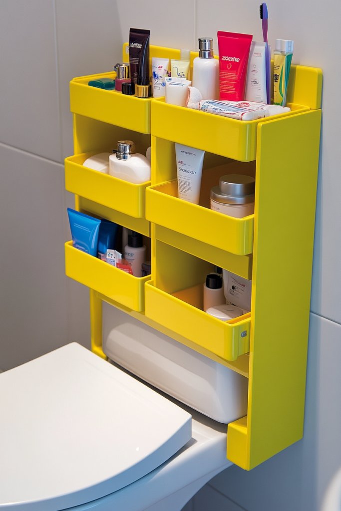 Picture a set of open cubes mounted above the toilet, painted in bright colors or bold neutrals. Inside each cube, vibrant baskets or bins hold toiletries, towels, or decorative items. The mix of open space and colorful accents creates a cheerful, youthful vibe. Soft lighting highlights the cheerful display, making your bathroom a happy place.