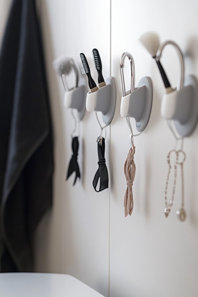 Visualize a row of small hooks mounted on the wall or behind the door, holding brushes, loofahs, or jewelry. Some hooks are magnetic, attaching directly to metal surfaces, while others stick securely with adhesive. They keep your items visible and easy to grab, reducing clutter and mess. This setup makes your bathroom look tidy and efficient.
