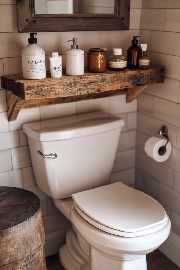 Visualize a rustic shelf made from weathered pallet wood or vintage crates, mounted above your toilet. The open design allows you to display decor or store essentials in baskets or jars. Its imperfect charm adds character and warmth to your bathroom. Combining textures and finishes makes it a focal point that tells a story.