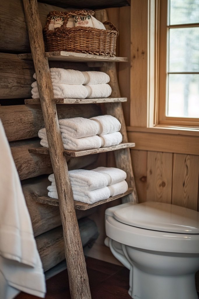 Picture a tall, leaning ladder made of warm oak or pine, placed behind the toilet. Its open rungs hold rolled towels, small baskets, or decorative jars, adding texture and depth. The natural grain of the wood adds an organic feel, bringing warmth and coziness. Soft lighting highlights its rustic charm, creating an inviting atmosphere.