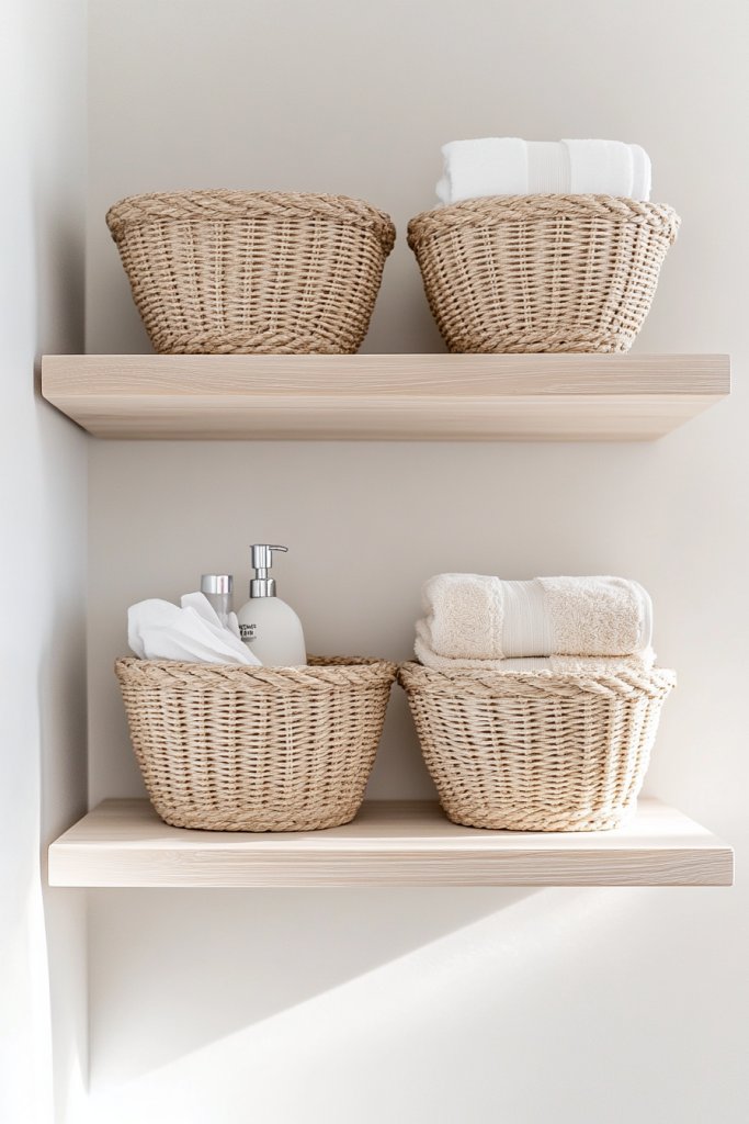 3. Floating Open Shelves with Decorative Baskets for Easy Access