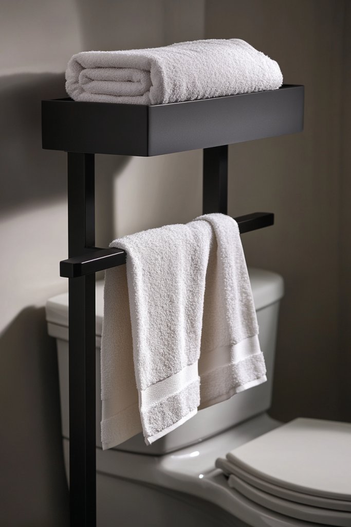 Envision a sleek metal or wood towel rack mounted above the toilet, with a shelf on top for toiletries or decorative items. Towels hang neatly on bars, while the shelf holds small baskets, jars, or even a decorative tray. The design is open and airy, with a modern or rustic finish that complements your decor. The combination offers both function and style.