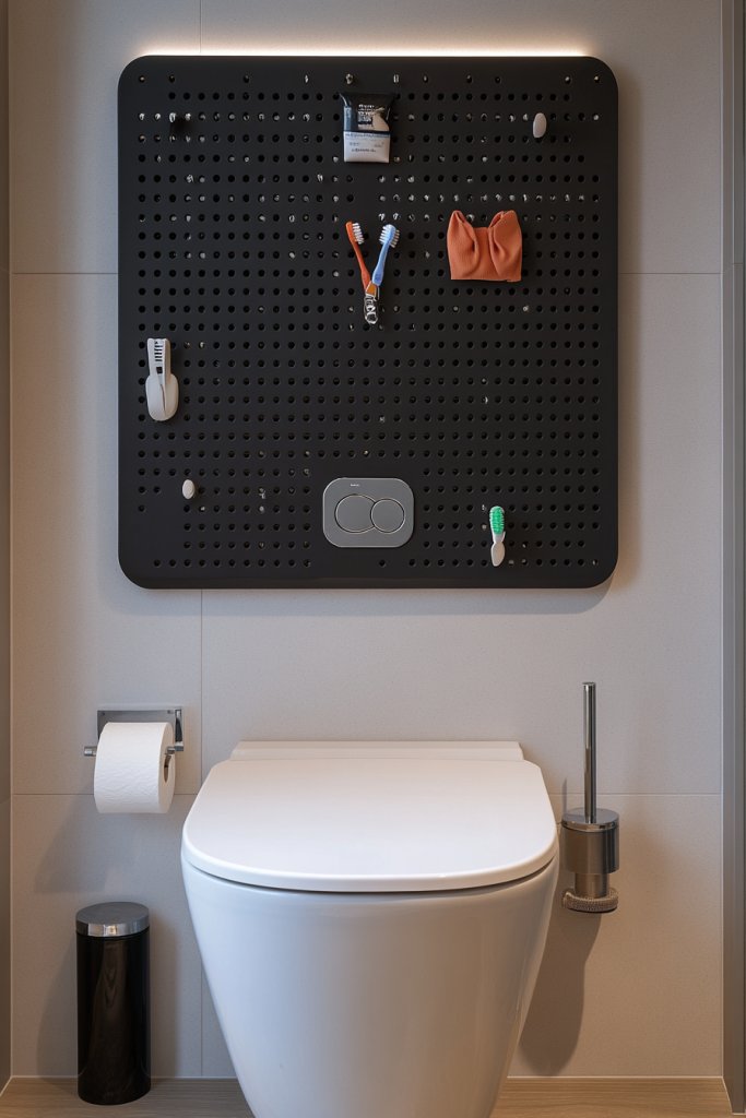 Picture a sleek metal strip or pegboard mounted above the toilet, with hooks, baskets, and clips holding various accessories. Small containers attach magnetically, keeping items like tweezers or nail clippers accessible. The arrangement is dynamic, allowing you to rearrange or add new hooks as your needs change. It’s a tidy, industrial-chic look.