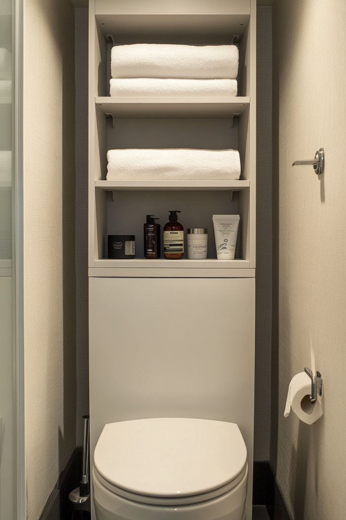 Envision a tall, slim bookshelf or cabinet with multiple adjustable shelves standing proudly behind your toilet. Its sleek design in wood or metal complements contemporary decor. The shelves can be repositioned to accommodate larger bottles or baskets, keeping everything neat and accessible. The design adds height and structure to the space, making it feel more open.