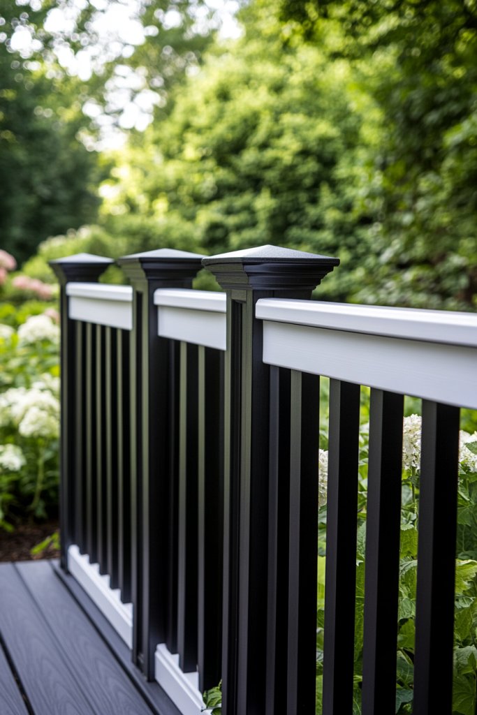 Picture sleek black balusters paired with crisp white rails or vice versa, creating a striking visual divide. The contrast draws the eye and enhances architectural features, making your deck look polished. Imagine the interplay of light and shadow on the glossy black elements against the matte white background. This style adds depth and dimension, transforming your outdoor area into a chic retreat.