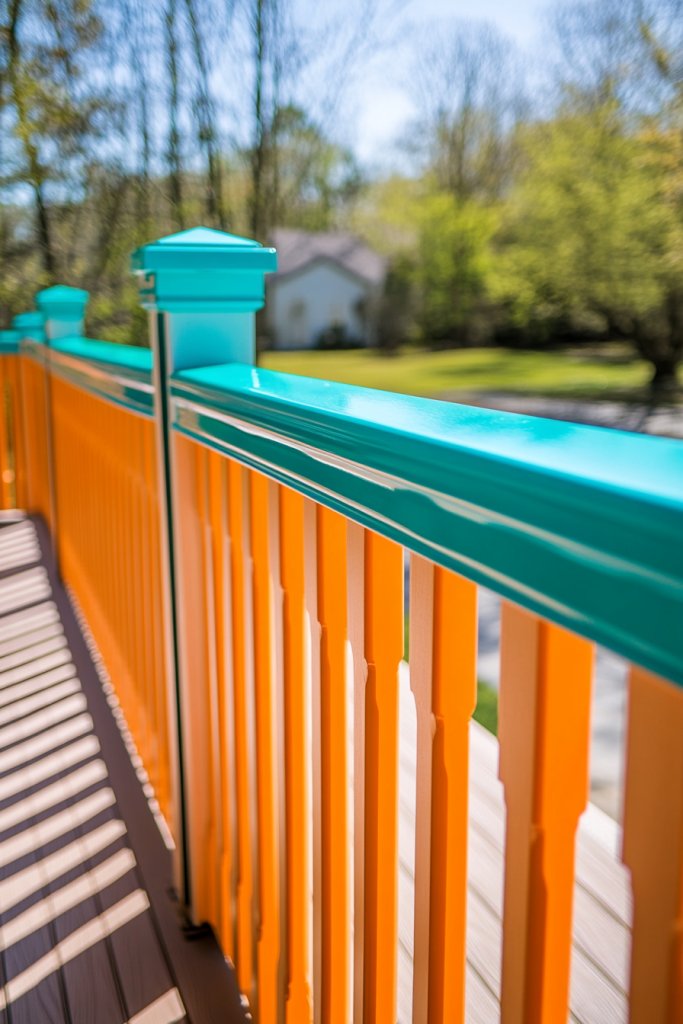 Imagine a railing painted in a vibrant turquoise or lively coral that contrasts against lush green foliage. The glossy finish catches the sunlight, making the color pop even more. Paired with neutral furniture and subtle landscaping, the bright railing becomes a focal point. It’s like adding a splash of paint to a blank canvas, transforming your deck into an energetic retreat that’s full of personality.