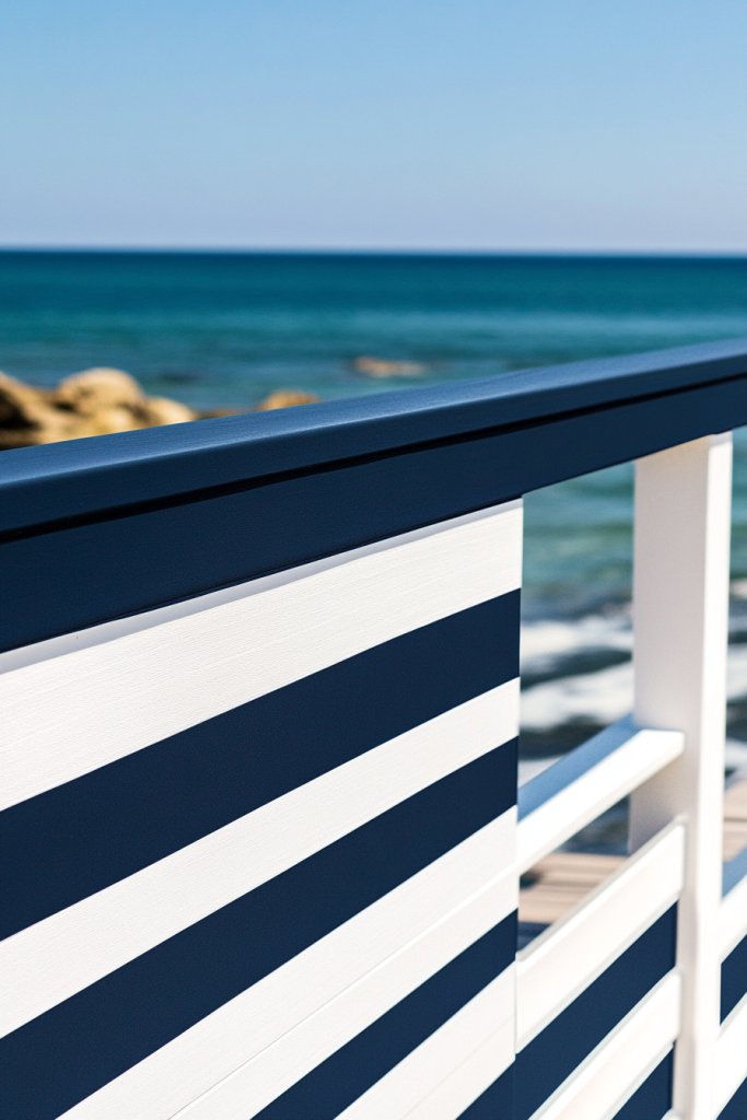 Imagine crisp white and navy or turquoise stripes running horizontally or vertically along your railing. The bold lines create a dynamic visual that mimics sailboats or beach umbrellas. When sunlight hits the stripes, they pop against the greenery and sky, creating a lively, refreshing environment. This pattern can be both subtle and statement-making, depending on the width and color choices.
