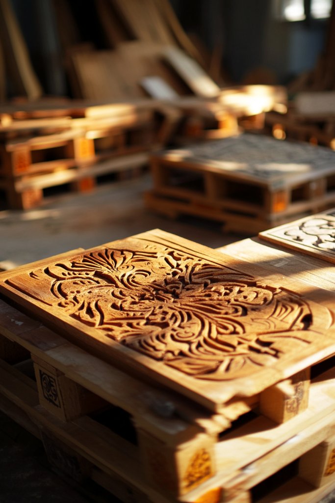 Picture a clean-lined pallet bed with intricate carvings or stencil designs in eco-friendly dyes. The patterns add depth and character, making the bed a focal point. Pair it with neutral bedding and minimalist decor to let the artwork stand out. The room feels personalized, vibrant, and inspiring.