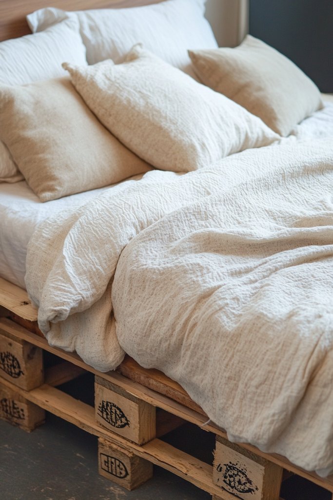 Picture a sturdy pallet frame dressed in soft, organic linens—perhaps in earthy tones or calming pastels. Natural pillows made from biodegradable or recycled fabrics complete the look. The bedding feels inviting, breathable, and free of harmful chemicals. The overall vibe is pure, simple, and deeply relaxing.