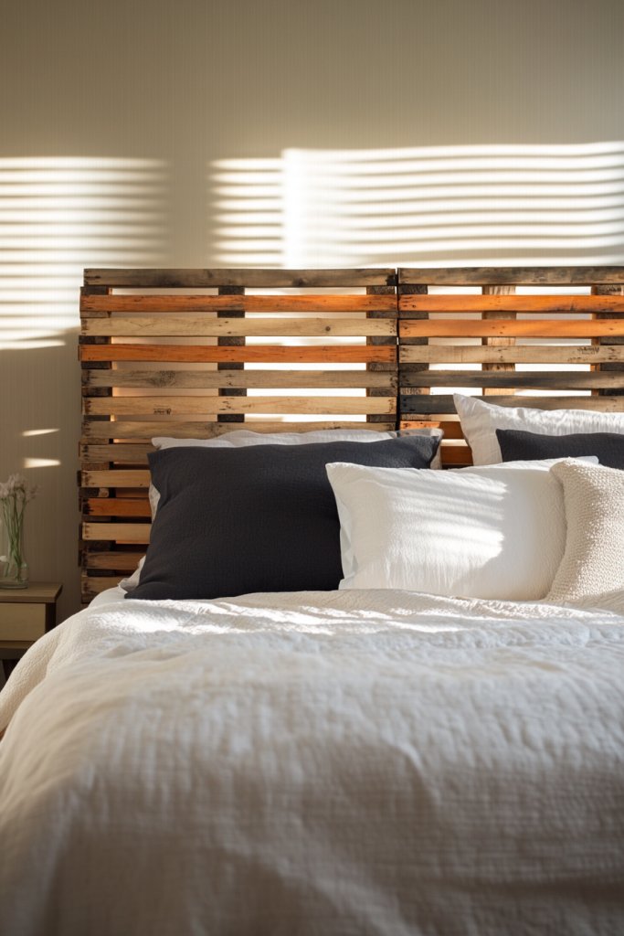 Looking to add visual interest and a touch of sophistication to your bed? A multi-layered pallet headboard with open slats creates a focal point without overwhelming your space. It’s a clever way to craft a statement piece that also promotes airflow and keeps your bedroom feeling fresh. Who says eco-friendly can’t be stylish?