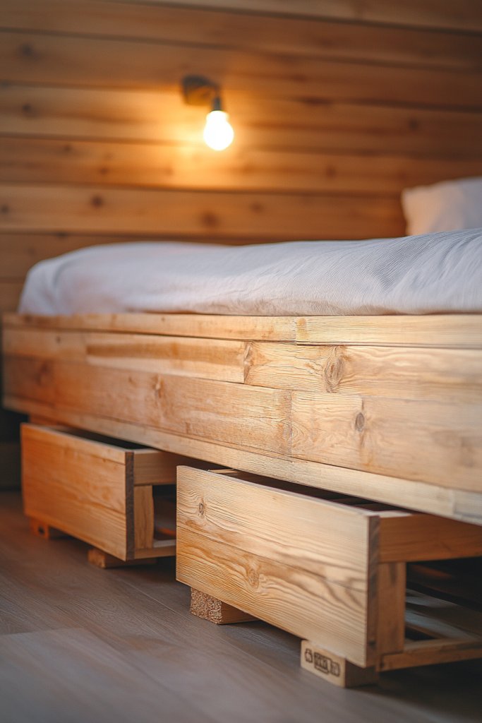 Visualize a sturdy pallet frame elevated slightly off the ground, with large drawers built into the base. The drawers slide smoothly, seamlessly integrating into the design. The natural wood finish pairs with simple linens, emphasizing both utility and style. It’s a smart, unobtrusive way to hide away your essentials while keeping the room tidy.