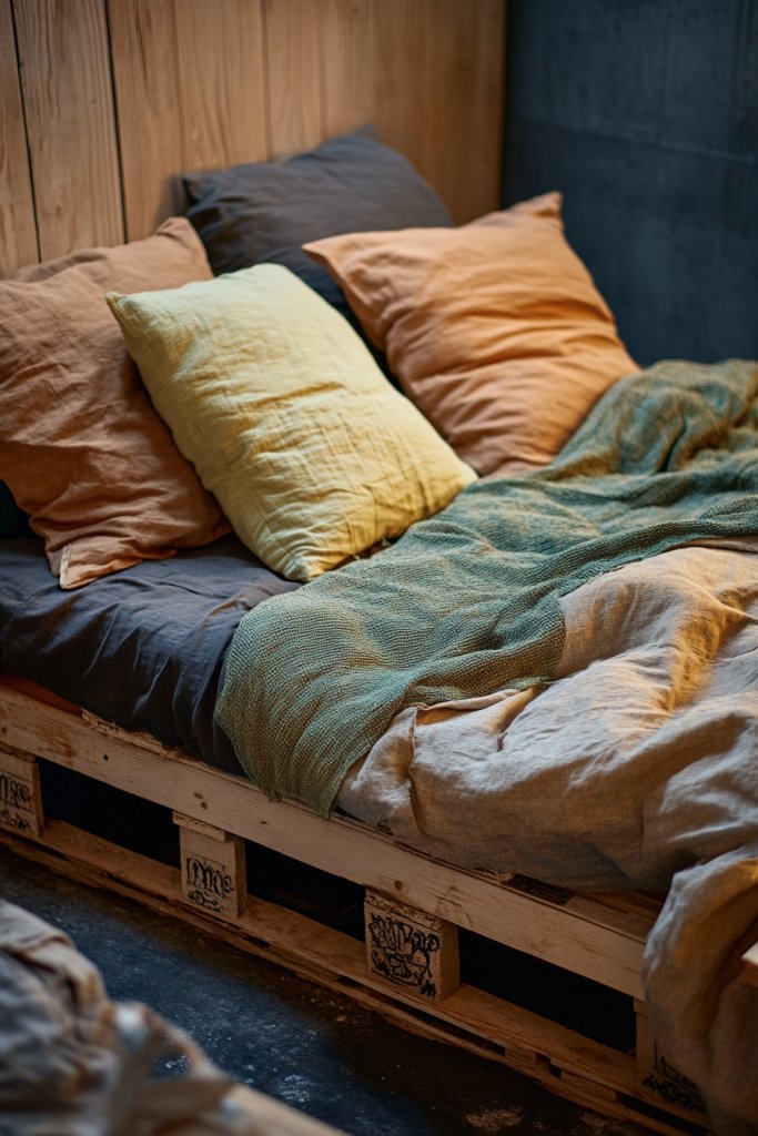 8. Pallet Bed with Recycled Fabric Bedding and Cushions