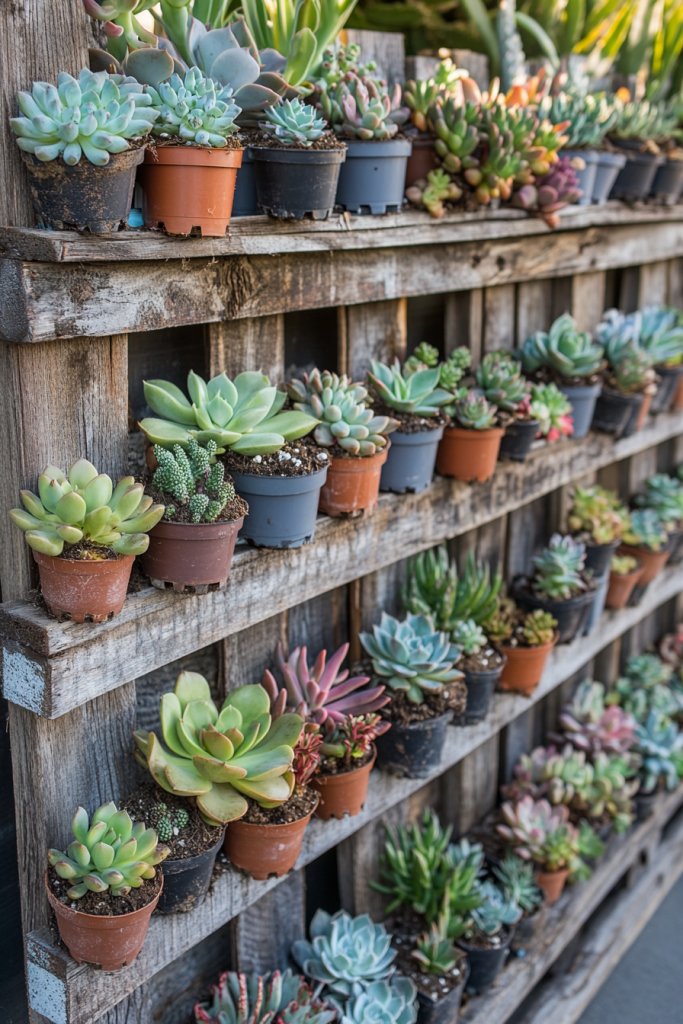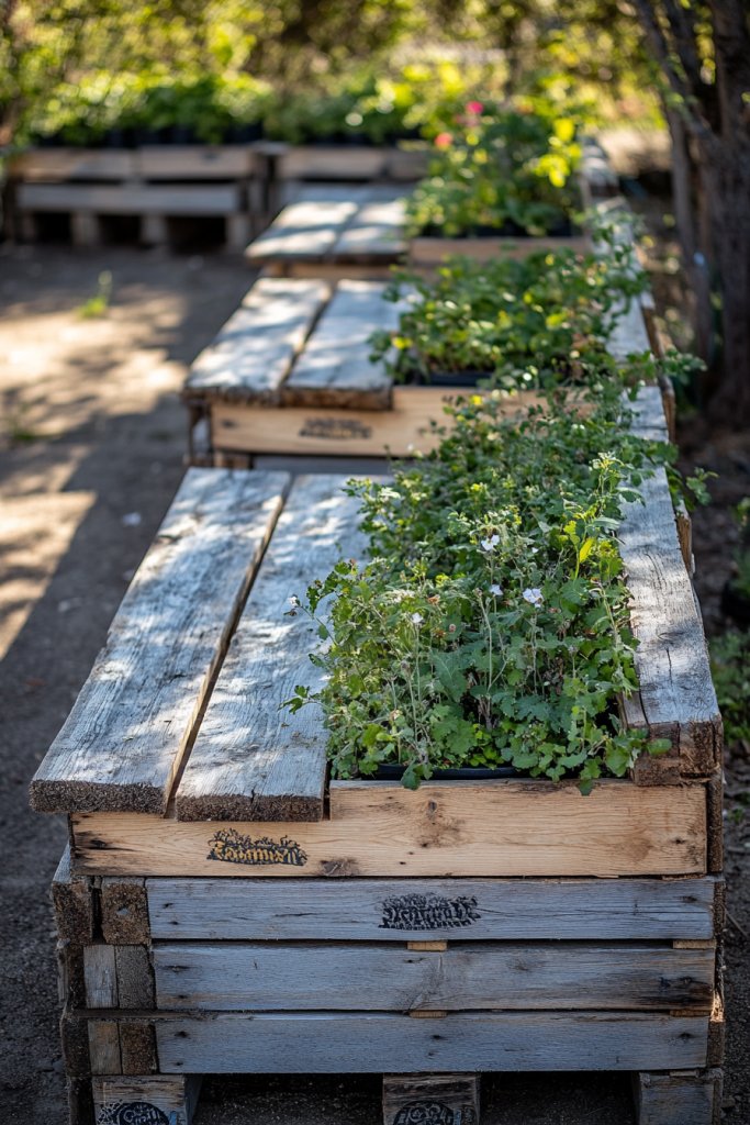 For a tiered effect, stack multiple pallets or add wooden planks for extra height. This idea works well in small garden plots, along fences, or even on patios with limited space, adapting easily to different garden styles or sizes.