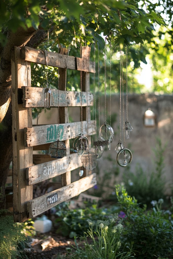 Plus, it makes your outdoor space more inviting and lively. Picture a weathered pallet with metal, glass, or wooden pieces hanging from its slats, gently clinking in the breeze.